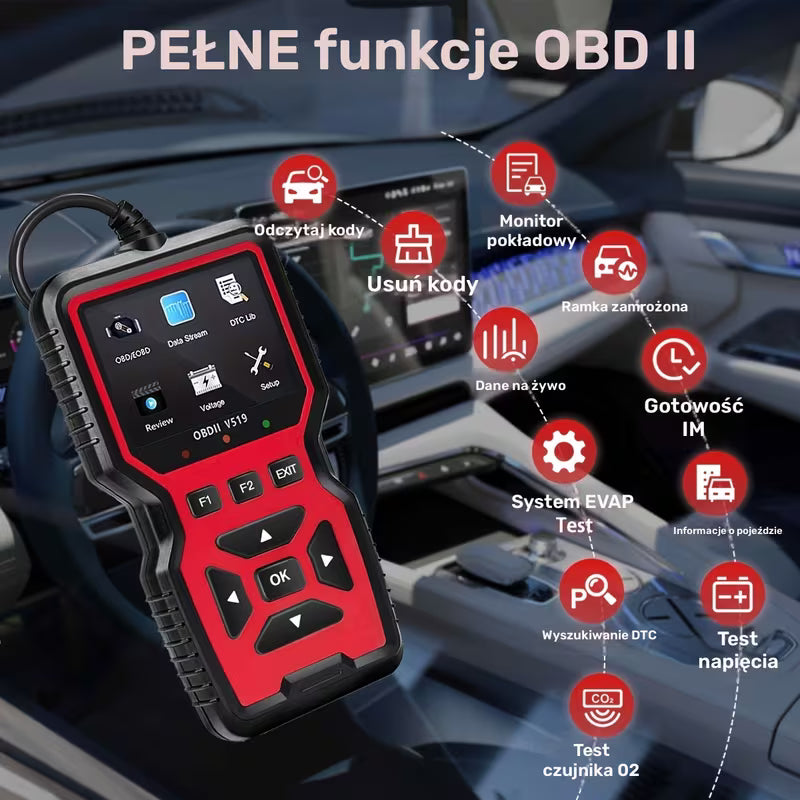 Pokazuje kody błędów silnika (Check Engine), opis problemu oraz dane w czasie rzeczywistym, takie jak obroty silnika, temperatura czy napięcie akumulatora.